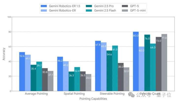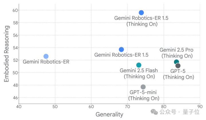 在学术基准测试中,GR-ER 1.5在空间推理、复杂指点、进度检测等任务上全面超越了GPT-5和Gemini 2.5 Flash,刷新了业界的表现上限。